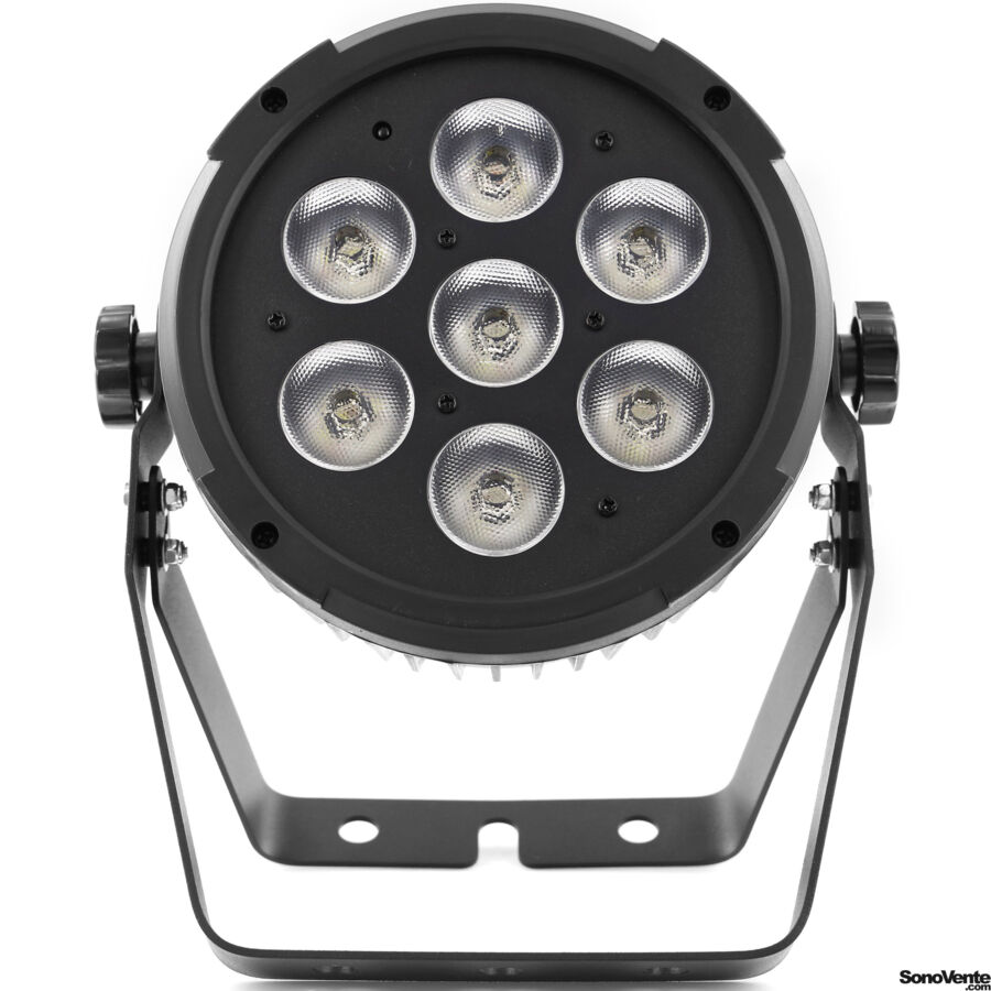 - PAR à LED- Sources lumineuses : 7 LED de 12 W RGBWA-UV 6-en-1 - Angle de projection : 25° - Éclairement : 8 640 Lux @ 1 m / 2 520 Lux @ 2 m - Pilotable en DMX, auto, musical, maître-esclave, télécommande IR - Boîtier en plastique - Alimentation par connecteur IEC mâle - Link possible par câble d'alimentation IEC femelle - Double étrier de pose ou fixation - Alimentation : 100-240 VAC / 50-60 Hz - Fusible : T 1 A - 250 VAC