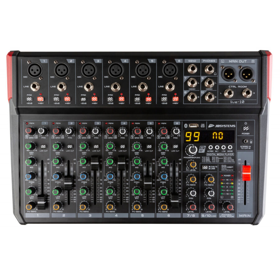 - 10 entrées sur 8 canaux (6 micro/ligne, 1 mono/ligne stéréo, 1 mono/ligne stéréo /USB/lecteur).