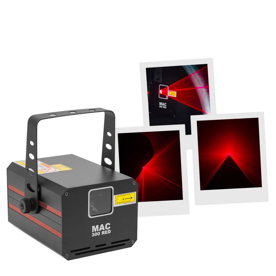 - MAC 300 RED- Source lumineuse : diode LASER 638 nm, puissance 300 mW - Class 3B - Couleur : rouge 638 nm - Clé de protection - Boîtier en aluminium - Faisceau LASER de 3 mm de diamètre - Système ''Scan Fail Safety'' qui coupe le LASER automatiquement en cas de défaut des moteurs des miroirs. - Scans à moteurs pas à pas ultra-rapides - Modes automatique / détection sonore / DMX - Canaux DMX : 10 - 200 programmes autos - Tension d'alimentation : 100-240 VAC / 50-60 Hz - Boîtier en 2 parties, pour la protection des composants sensibles à la poussière (ATS Technology) - Consommation électrique : 50 W max. - Dimensions: 183 x 132 x 115 mm - Poids : 1,5 kg - Bouton d'arrêt en option AVERTISSEMENT - RAYONNEMENT LASER EXPOSITION AU FAISCEAU DANGEREUSE APPAREIL A LASER DE CLASS 3B