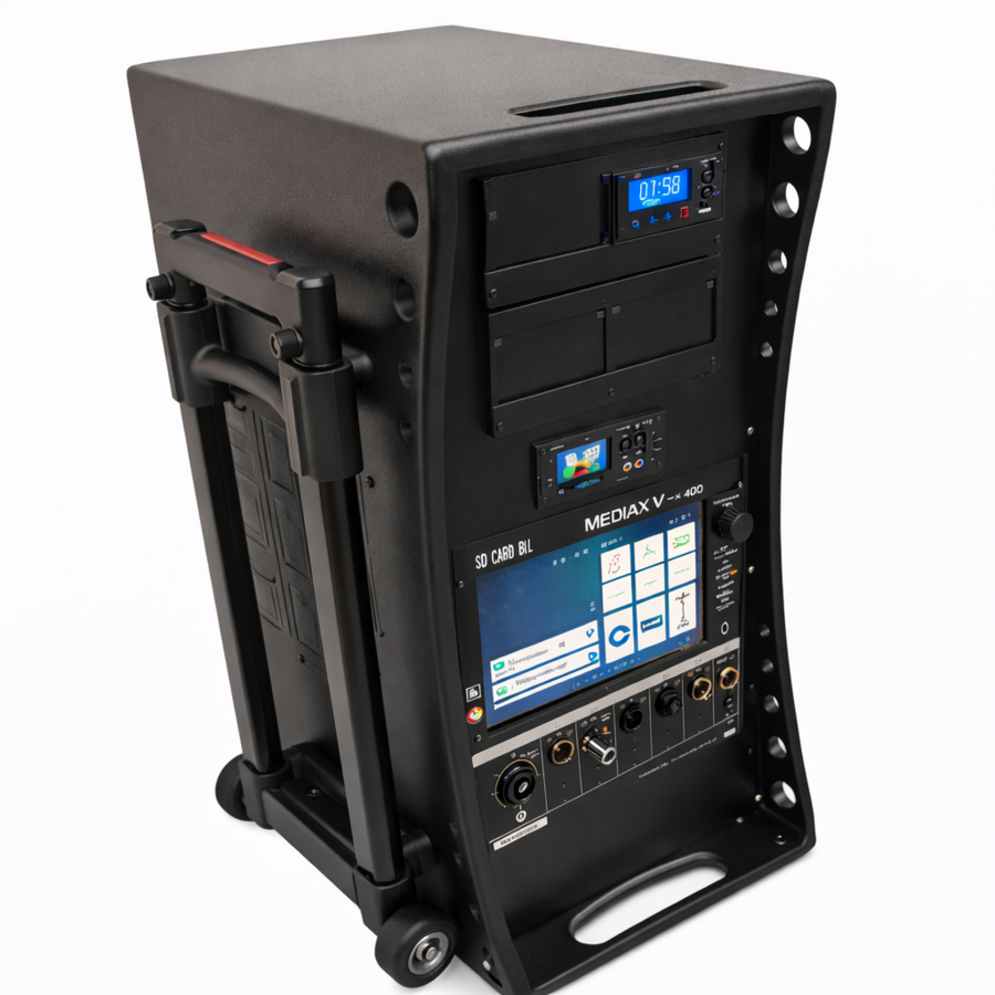 Le Mediax Touch est une enceinte portable amplifiée de 250 W RMS, équipée d’un écran tactile couleur 7 pouces et conçue pour offrir une sonorisation complète, flexible et intuitive.